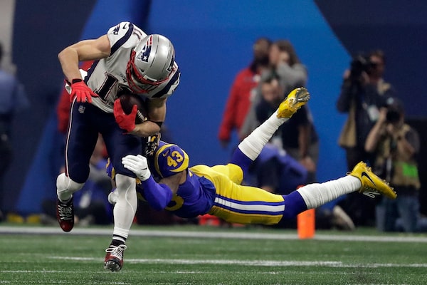 New England Patriots Julian Edelman (11) breaks a tackle by Los Angeles Rams' John Johnson III (43) during the second half of the Super Bowl on Sunday,.Jeff Roberson/The Associated Press