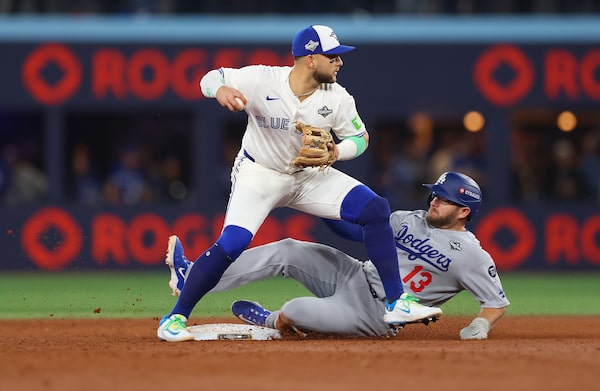 Bo Bichette (left) forces Max Muncy (right) of the Los Angeles Dodgers out during the sixth inning in Game 7 of the World Series at Rogers Centre.Gregory Shamus/Getty Images