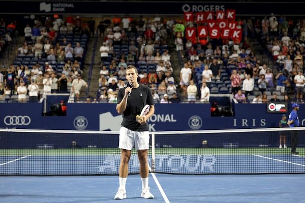 Then a thank-you video played inside Sobey’s Stadium with a montage of Pospisil’s biggest career moments. Through tears, he then delivered an emotional thank-you speech to everyone seated in his player box – from family to coaches and Davis Cup teammates.