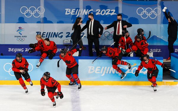 Canada players celebrate victory against United States in the women's hockey final at the Wukesong Sports Centre, Beijing, China, Feb. 17, 2022.DAVID W CERNY/Reuters