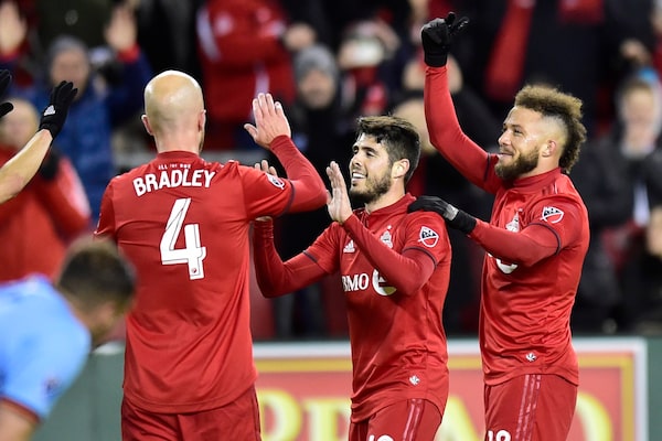 Toronto FC's Alejandro Pozuelo celebrates with teammates Michael Bradley (4) and Nick DeLeon (18) after scoring against New York City during second half MLS action in Toronto, on Friday, March 29, 2019.Chris Young/The Canadian Press