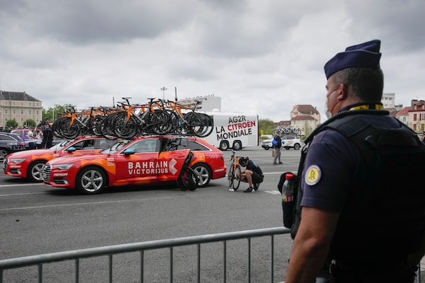 A French gendarme watches a Bahrain Victorious team mechanic prepare the riders' bicycles prior to the 18th stage of the Tour de France, on July 15.Christophe Ena/The Associated Press