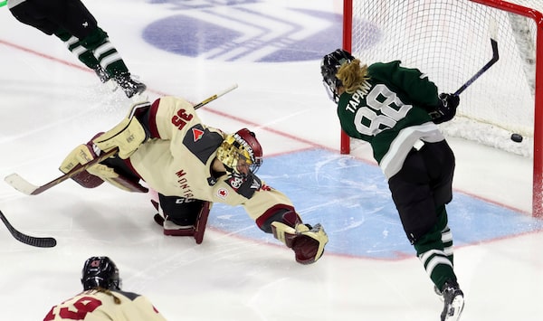Boston forward Susanna Tapani, right, scores against Montreal goalie Ann-Renee Desbiens during overtime in a PWHL playoff hockey game in Lowell, Mass., on May 14.Mark Stockwell/The Associated Press