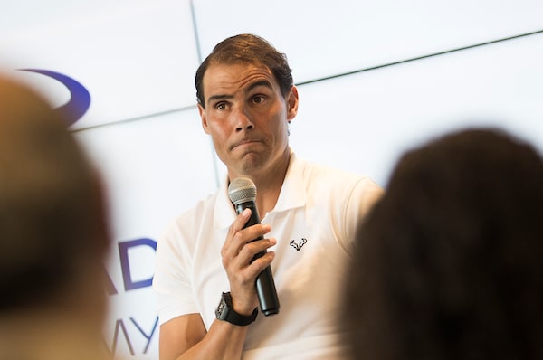 Tennis player Rafael Nadal says during a press conference that he will not compete in the French Open, at the Rafa Nadal Academy in Manacor, on Mallorca, Spain, on May 18. The 22-time Grand Slam winner has battled to recover from a hip injury he sustained in January at the Australian Open, not playing since then.JAIME REINA/AFP/Getty Images