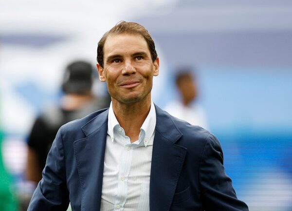 Spain's Rafael Nadal reacts after completing the honorary kickoff before the match on April 30, 2022.JUAN MEDINA/Reuters