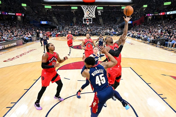 RJ Barrett of the Toronto Raptors shoots over Donovan Mitchell of the Cleveland Cavaliers. Barrett scored 24 points.Jason Miller/Getty Images