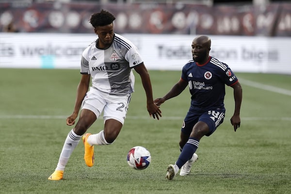 New England Revolution's Ema Boateng (18) defends against Toronto FC's Deandre Kerr (29) during the first half of an MLS soccer match Saturday, June 24, 2023The Canadian Press