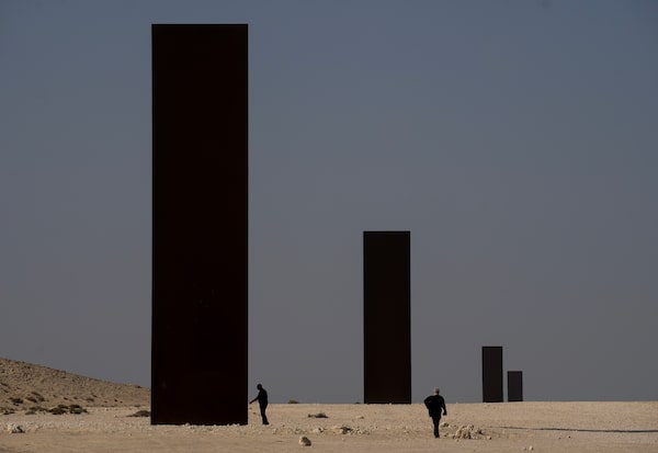 People overlook famous American artist Richard Serra's 'East-West/West-East' art as it stands in a desolate section of the Brouq nature reserve in Qatar's northwestern desert. The Four steel plates, each 14 metres high, span a one-kilometer stretch of the desert.Nathan Denette/The Canadian Press