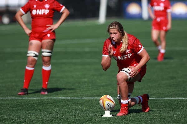 Team Canada’s Sophie de Goede lines up for a penalty kick against Team Italy during second half test match rugby action at Starlight Stadium in Langford, B.C., on July 24, 2022.CHAD HIPOLITO/The Canadian Press