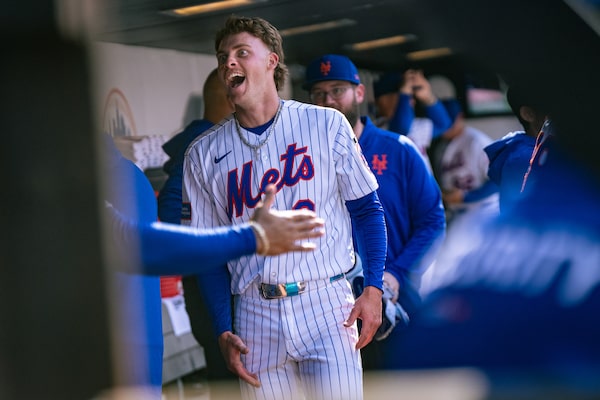 New York Met Carson Benge (3) celebrates scoring a home run during the sixth inning of his MLB debut, an opening-day game against the Pittsburgh Pirates on Thursday in New York.Angelina Katsanis/The Associated Press