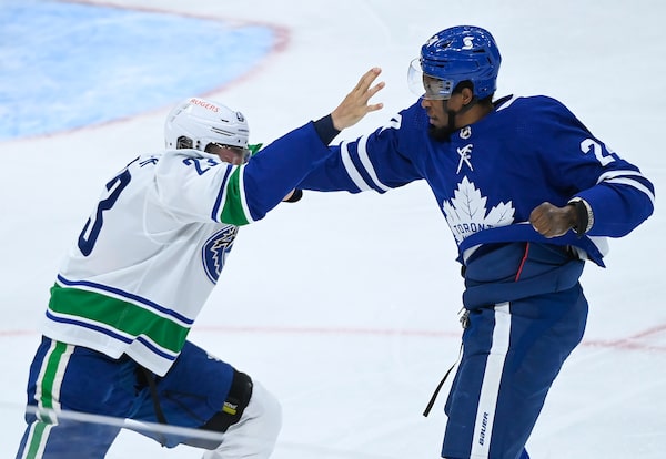 Toronto Maple Leafs forward Wayne Simmonds, right, fights Vancouver Canucks defenceman Alexander Edler during first period action in Toronto on April 29, 2021.Nathan Denette/The Canadian Press