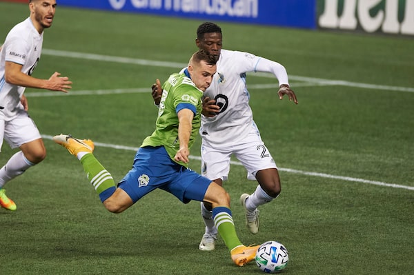 Seattle Sounders forward Jordan Morris takes a shot on goal against Minnesota United defender Bakaye Dibassy during the second half in a playoff game at CenturyLink Field. The Seattle Sounders won 3-2.Troy Wayrynen/USA TODAY Sports via Reuters