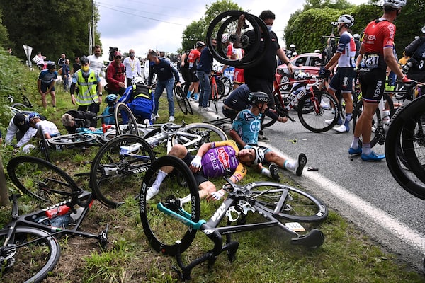 Italy's Kristian Sbaragli, left, and France's Bryan Coquard, right, lie on the ground after crashing during the first stage of the Tour de France.Anne-Christine Poujoulat/AFP/Getty Images