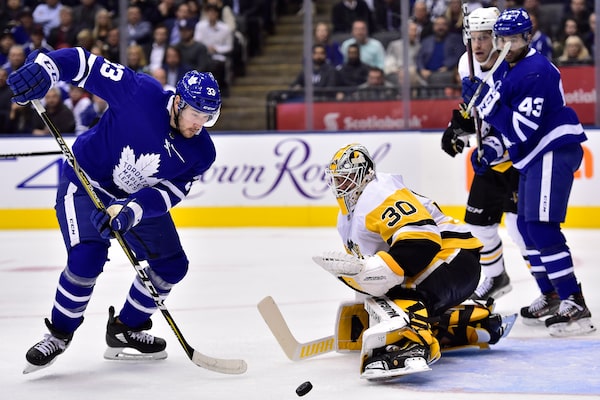 Toronto Maple Leafs centre Frederik Gauthier (33) and Pittsburgh Penguins goaltender Matt Murray (30) watch the puck during second period NHL hockey action in Toronto on Thursday, Oct. 18, 2018.Frank Gunn/The Canadian Press