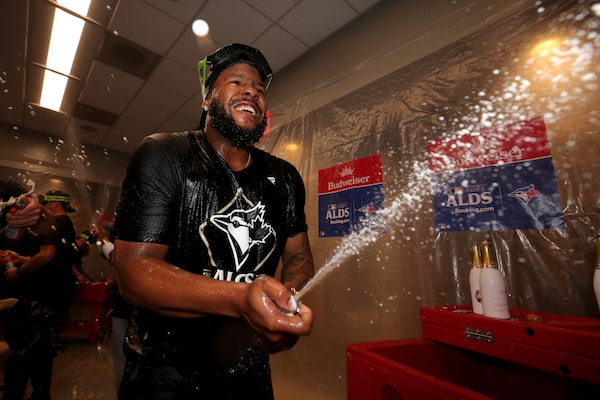 Toronto Blue Jays first baseman Vladimir Guerrero Jr. celebrates in the locker room after defeating the New York Yankees in game four of the ALDS.Brad Penner/Reuters