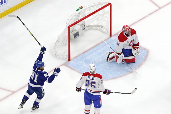 Tampa Bay's Steven Stamkos celebrates a goal by Anthony Cirelli (not pictured) past Montreal goaltender Carey Price in game wwo of the 2021 NHL Stanley Cup Final at Amalie Arena in Tampa, Fla.Mike Carlson/Getty Images