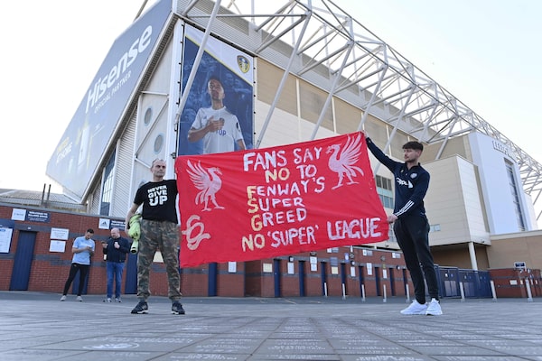 Leeds United fans hold a banner protesting plans for a European Super League ahead of a match against Liverpool in Leeds on April 19, 2021.PAUL ELLIS/AFP/Getty Images