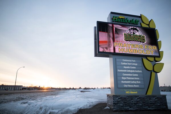 A sign near the Elgar Petersen Arena in Humboldt, Sask., projects a message of grief on Sunday.NOEL WEST/The New York Times News Service