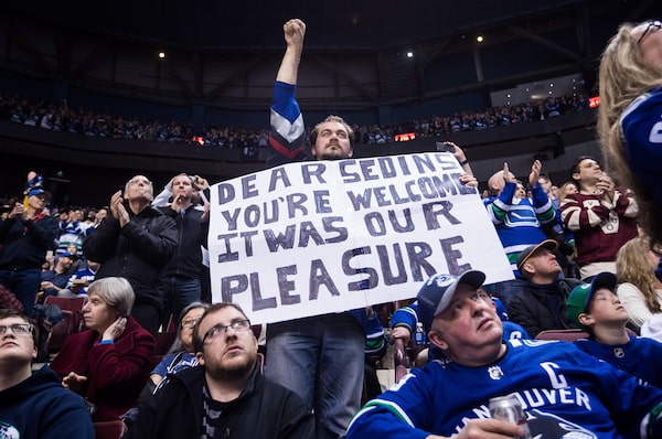 A fan holds a sign thanking the Sedin twins during their final home game in Vancouver.DARRYL DYCK/The Canadian Press