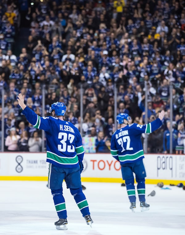 Henrik and Daniel Sedin wave to the crowd after defeating the Arizona Coyotes 4-3 in Vancouver on Thursday, April 5, 2018.DARRYL DYCK/The Canadian Press