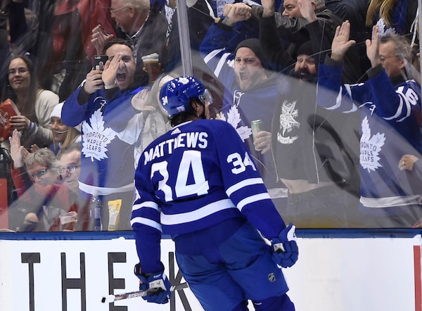 Auston Matthews celebrates his power-play goal during the third period against the Vegas Golden Knights in Toronto on Nov. 7, 2019.Nathan Denette/The Canadian Press
