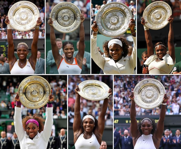 A combination of photographs shows U.S. player Serena Williams posing with the Venus Rosewater Dish trophy on each of her seven women's singles Wimbledon Championships victories at The All England Lawn Tennis Club in Wimbledon, southwest London, (L-R top) in 2002, 2003, 2009, 2010 and (L-R bottom) 2012, 2015, 2016.GERRY PENNY/AFP/Getty Images
