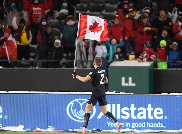 Canada's Alistair Johnston parades the flag to celebrate the win over Mexico during World Cup Qualifiers in Edmonton on Nov. 16.JASON FRANSON/The Canadian Press