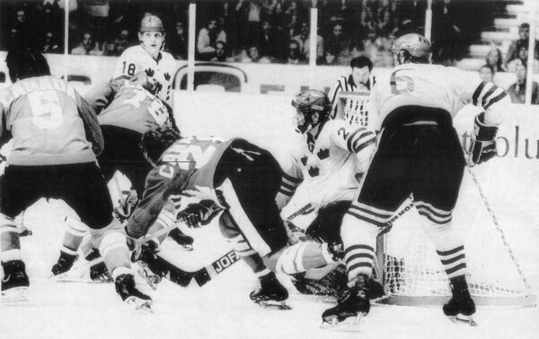 Team Canada plays the Swedish National Team on Sept. 17, 1972 as part of a 2-game exhibition series prior to their heading off to Moscow for the final half of the Canada-Russia Summit Series. A pileup occurs near the Swedish net as Team Canada attempts to score. Canadian players are Brad Park (5), Paul Henderson (19), and Bobby Clarke (28). Swedish player at right is Thommy Abrahamsson (6). Team Canada won the game, 4-1.CP