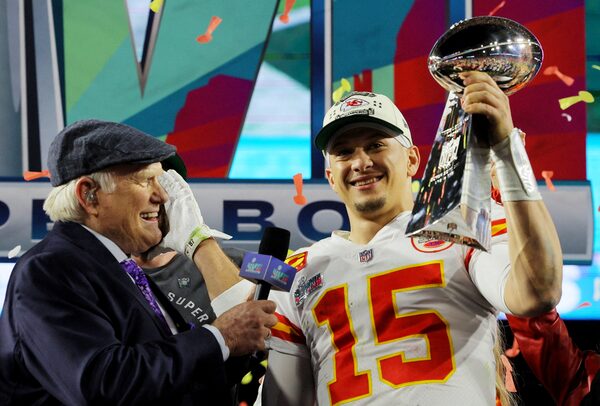 Kansas City Chiefs' QB Patrick Mahomes celebrates with the Vince Lombardi Trophy after winning Super Bowl LVII in Glendale, Ari., on Feb. 12, 2023.BRIAN SNYDER/Reuters