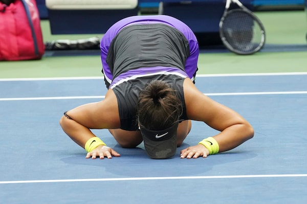 Bianca Andreescu of Canada reacts after defeating Serena Williams of the U.S. in the women's singles final during the U.S. Open at Arthur Ashe Stadium, in New York, Sept. 7, 2019. Andreescu defeated Williams, 6-3, 7-5, to win her first Grand Slam title, denying Williams her 24th. (Michelle V. Agins/The New York Times)MICHELLE V. AGINS/The New York Times News Service