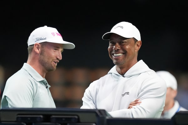 Tiger Woods, right, talks with The Bay Golf Club's Wyndham Clark during warmups for the inaugural match of the Tomorrow's Golf League, between New York Golf Club and The Bay Golf Club, on Jan. 7, in Palm Beach Gardens, Fla.Rebecca Blackwell/The Associated Press