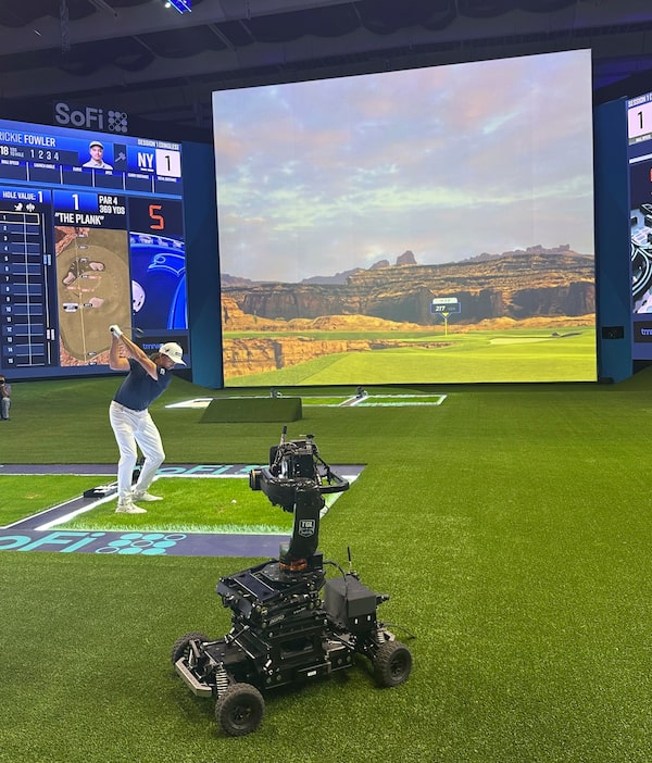 Rickie Fowler hits into the massive simulator screen at the SoFi Center in Palm Beach Gardens, Fla, on Dec. 18, 2024. The 250,000-square-foot complex holds the new TMRW Golf League co-owned by Tiger Woods and Rory McIlroy.Doug Ferguson/The Associated Press