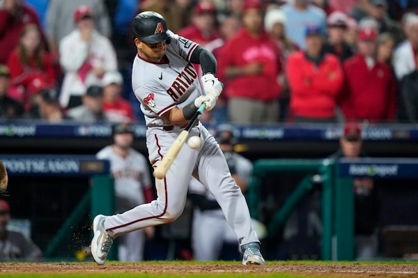 Arizona Diamondbacks' Gabriel Moreno hits an RBI-single against the Philadelphia Phillies during the fifth inning in Game 7 of the baseball NL Championship Series in Philadelphia on Oct. 24.Matt Slocum/The Associated Press
