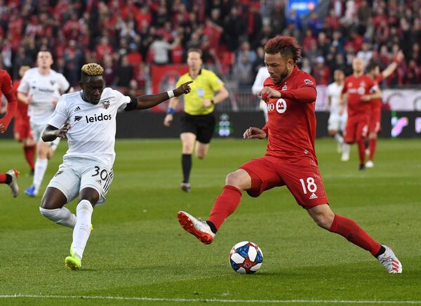 Formerly of D.C. United, TFC midfielder Nick DeLeon steps over the ball in an effort to get past defender Akeem Ward during a match on May 15, 2019, at BMO Field. Toronto took a franchise record 20 shots in the first half, with seven of them on-target.Dan Hamilton/USA TODAY Sports via Reuters
