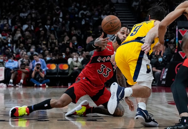 Toronto Raptors guard Gary Trent Jr. battles for the loose ball against Indiana Pacers guard T.J. McConnell in Toronto on Oct. 27.Nathan Denette/The Canadian Press