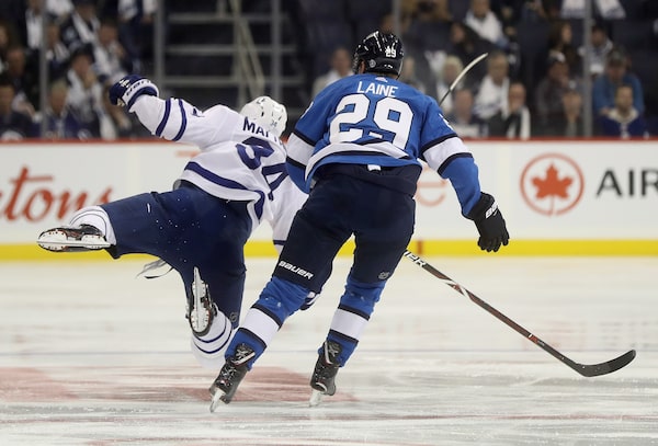Toronto Maple Leafs' Auston Matthews (34) flies through the air after colliding with Winnipeg Jets' Mark Scheifele, not shown, in front of Patrik Laine (29) during second period NHL hockey action in Winnipeg, on Oct. 24, 2018.Trevor Hagan/The Canadian Press