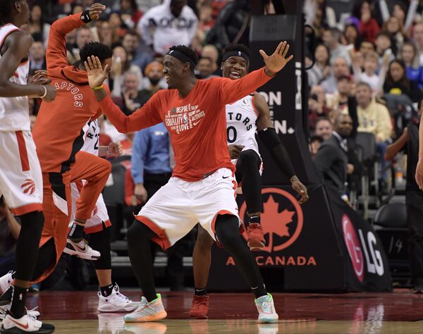 Toronto Raptors guard Terence Davis II (0) celebrates with forward Pascal Siakam (43, center) and other team mates after scoring a basket against Chicago in the second half at Scotiabank Arena in Toronto, on Feb. 2, 2020.Dan Hamilton/USA TODAY Sports via Reuters