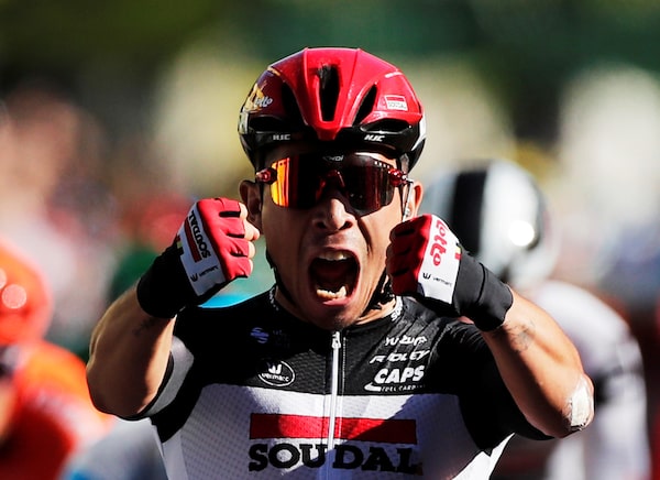 Lotto Soudal rider Caleb Ewan of Australia celebrates winning the third stage of the Tour de France in Sisteron on Aug. 31, 2020.BENOIT TESSIER/Reuters