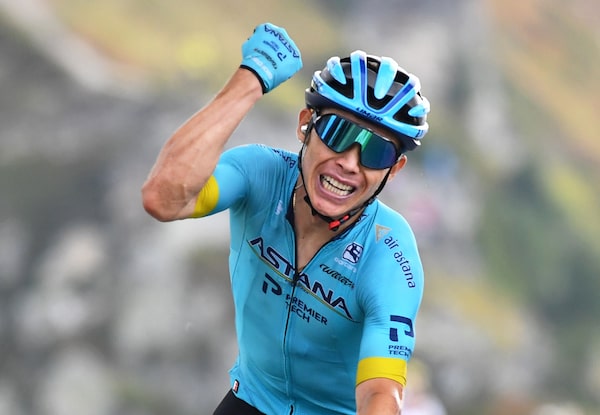 Miguel Angel Lopez crosses the finish line to win stage 17 of the Tour de France in Meribel, France, on Sept. 16, 2020.STUART FRANKLIN/Reuters