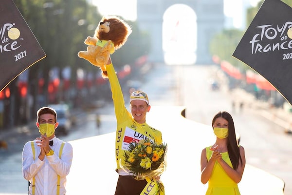 Tour de France winner Slovenia's Tadej Pogacar, wearing the overall leader's yellow jersey, celebrates on the podium after the 21st and last stage of the Tour de France cycling race over 108.4 kilometers with start in Chatou and finish on the Champs Elysees in Paris on July 18, 2021.The Canadian Press