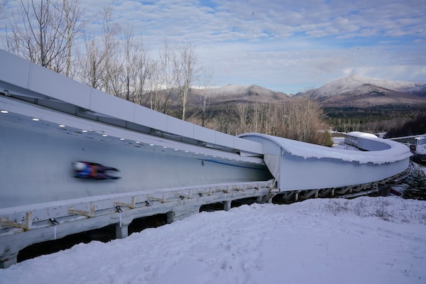 A luger slides down the track during the World Cup luge event in Lake Placid, N.Y., Friday, Dec. 8, 2023.Seth Wenig/The Associated Press