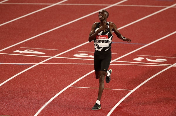 Uganda's Joshua Cheptegei celebrates victory in the Men's 5000 metres during the Herculis EBS Monaco 2020 Diamond League meeting at Stade Louis II on Aug. 14, 2020 in Monaco.Guillaume Horcajuelo/Getty Images