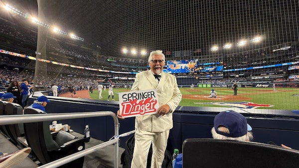 A Colonel Sanders impersonator sent by KFC Canada to promote their newly renamed sandwich, is seen in this handout photo, behind home plate at Game 2 of the World Series, in Toronto, on Saturday.HO/The Canadian Press