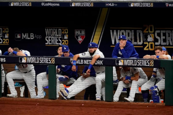 Members of the Los Angeles Dodgers watch during the seventh inning in Game 2 of the baseball World Series against the Tampa Bay Rays on Oct. 21, 2020, in Arlington, Texas.The Associated Press