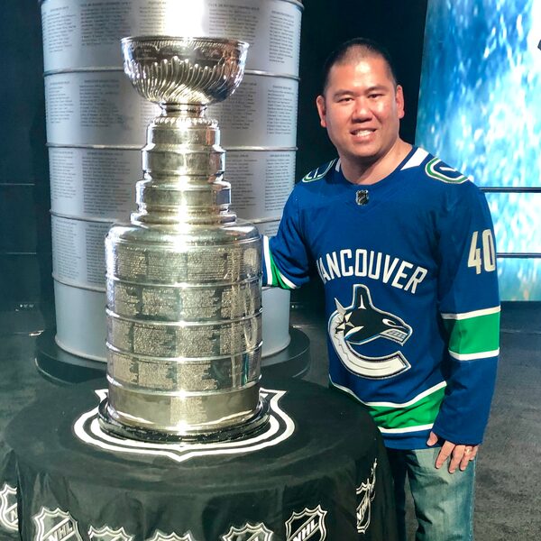 Vancouver Canucks superfan Clayton Imoo shares a moment with the Stanley Cup during the 2019 NHL All-Star Weekend in San Jose, CA.
