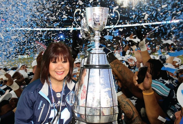 Lori Bursey, president of the Friends of the Argonauts fan club, next to the Grey Cup.