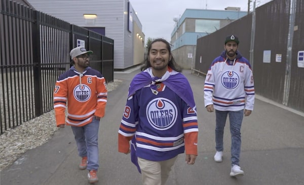 Oilers superfans and Edmonton dance instructors from left: Ryan Ocol, Josh Capulong and Harman Baweja, who created the Oilers Celly Challenge dance in 2018.