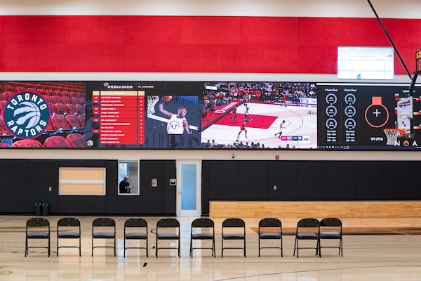 The hardware upgrade, he explains, was born out of conversations with the team’s head coach, Nick Nurse, who envisioned installing a giant screen – like the ones that hang above centre court at Scotiabank Arena – in the practice facility.