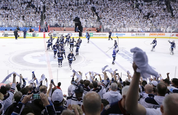 Winnipeg Jets players salute their fans after winning Game 1 of their first-round playoff series against the Minnesota Wild on Wednesday.Jason Halstead/Getty Images