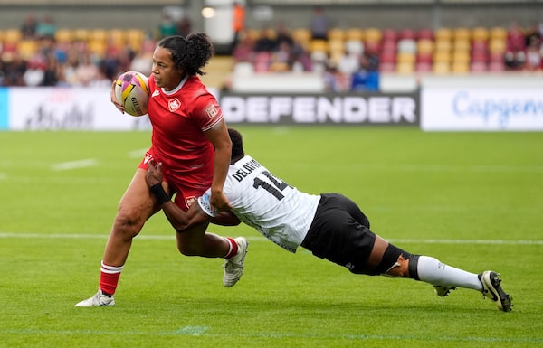 Canada's Fancy Bermudez gets past Fiji's Ilisapeci Delaiwau during the Women's Rugby World Cup 2025 in York, England on Saturday.Danny Lawson/The Associated Press